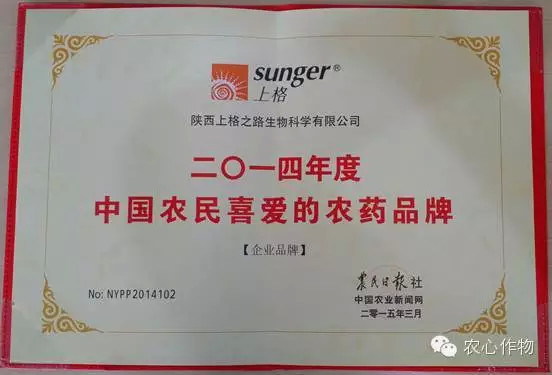 陕西上格之路荣获“2014年度中国农民最喜爱的农药品牌第二名