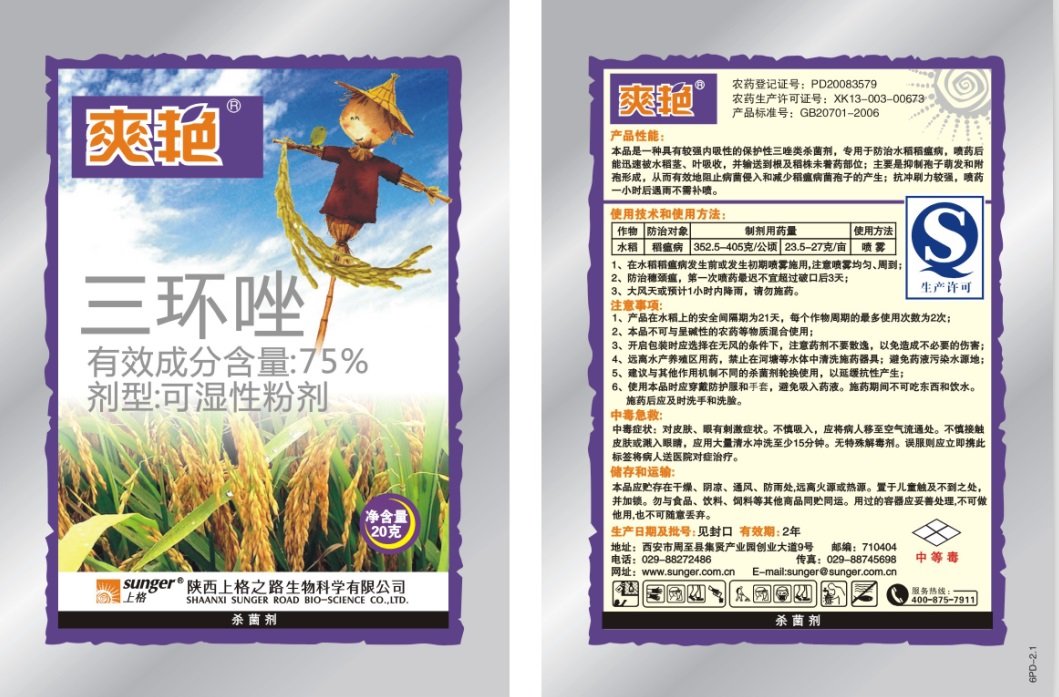 1. 我公司陕西上格之路生物科学有限公司所生产的三环唑75%可湿性粉剂,产品名爽艳,产品规格20克×25袋×6盒,均经过出厂检测并附带产品合格证。我公司生产的合格产品三环唑75%可湿性粉剂包装及规格如下图,非此包装的一切相关产品均为假冒伪劣产品。